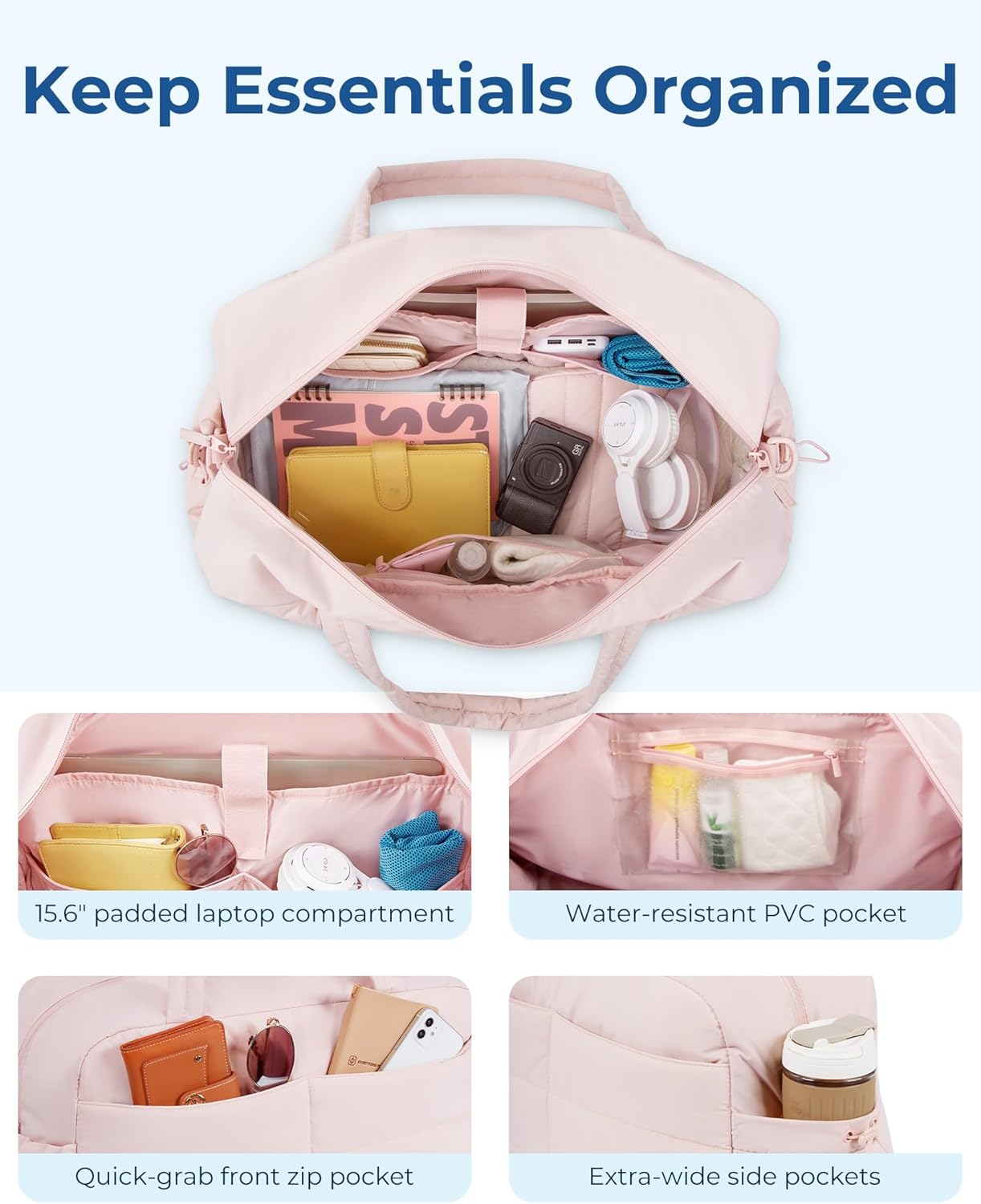 Travel Duffle Bag Gym Bag for Women, 31L Puffer Tote Bag Quilted Laptop Carry on, Weekender Overnight Bag Organizer Duffel Bag for Travel, Pink